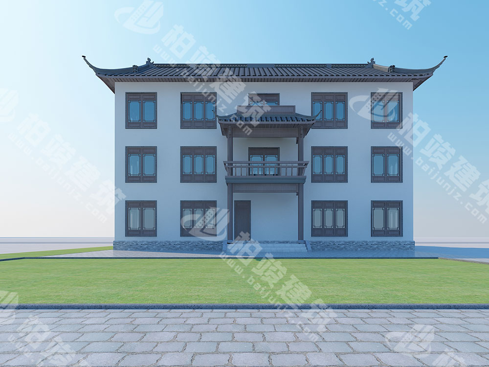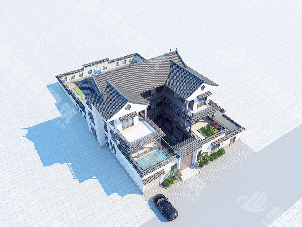 农村自建三层三合院设计图,内部10室,带大面积中式庭院